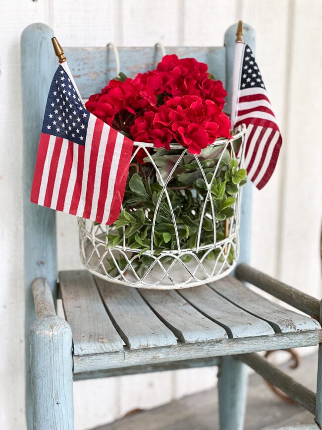 A vintage toddler chair ads the perfect touch of blue for a patriotic greeting.