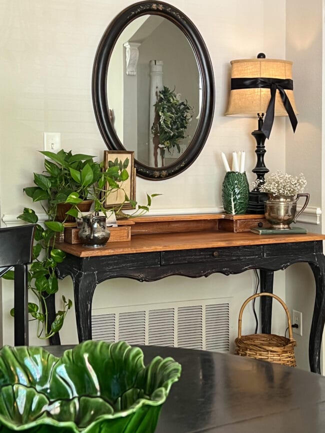 For example, I had a vintage tea cart sitting where the new sideboard is now. It was given to me by my in-laws. However, I never really thought it looked quite right. Sure, I moved it around and decorated it for different holidays, but it was just meh. And meh will never make me smile. So, do you think the new piece works best as a desk or the new sideboard for the dining room? I vote sideboard!